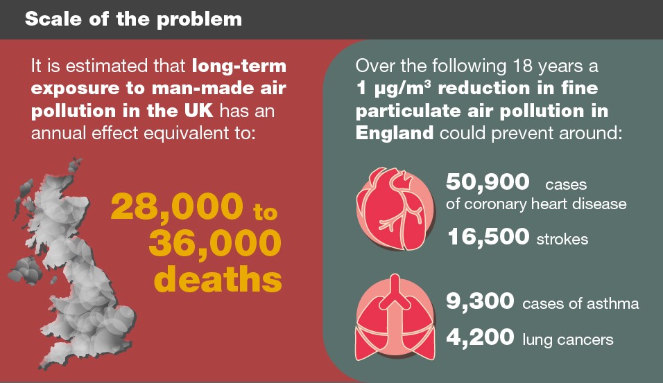 Short-term exposure to elevated levels of air pollution can cause a range of health effects and is a particular threat to vulnerable groups, including the elderly, very young, and those with existing health issues. However, long term exposure affects us all, with long-term exposure to man-made air pollution in the UK known to shorten lifespans.